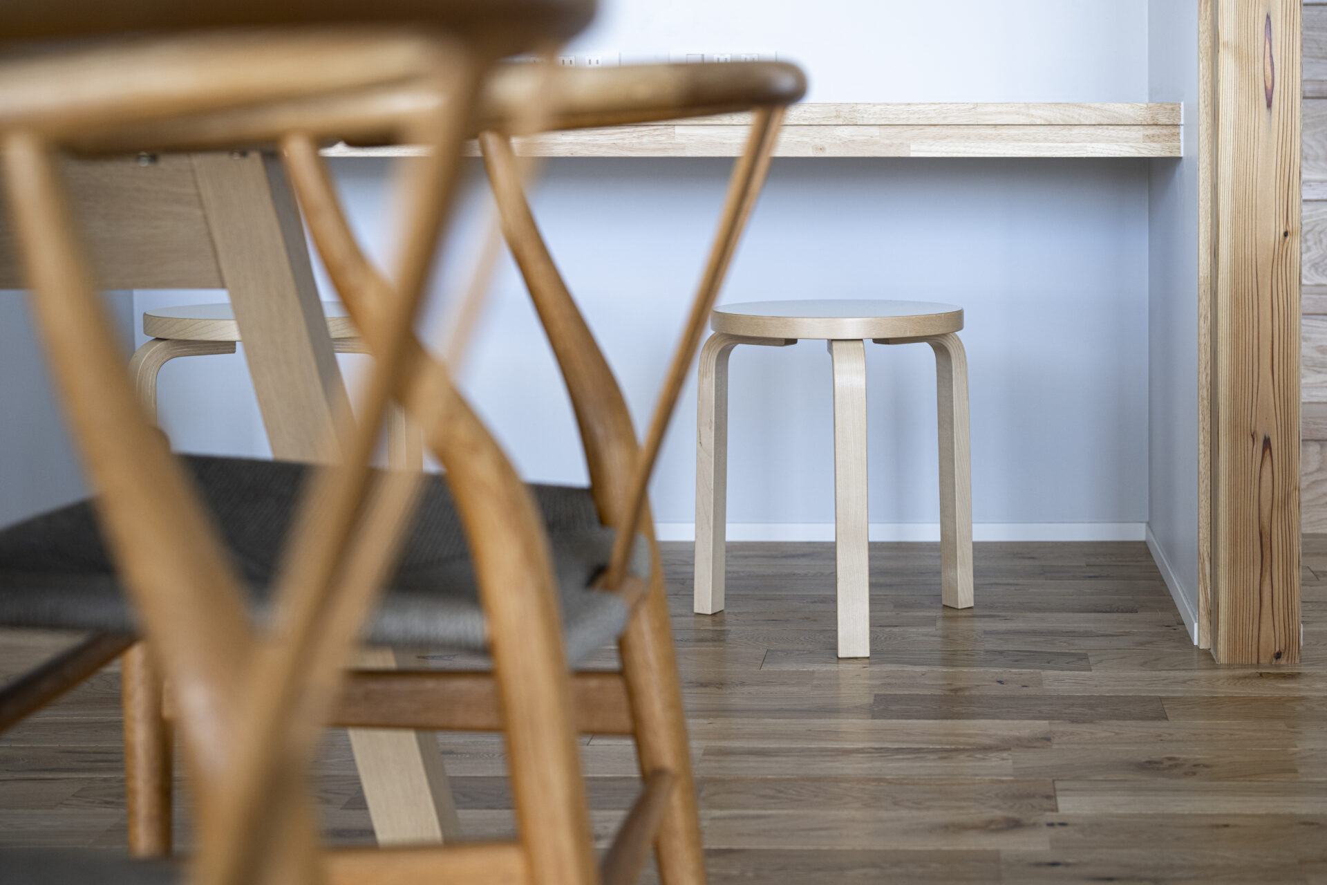 一階は、塗装の壁と、無垢床で、質感たっぷり、