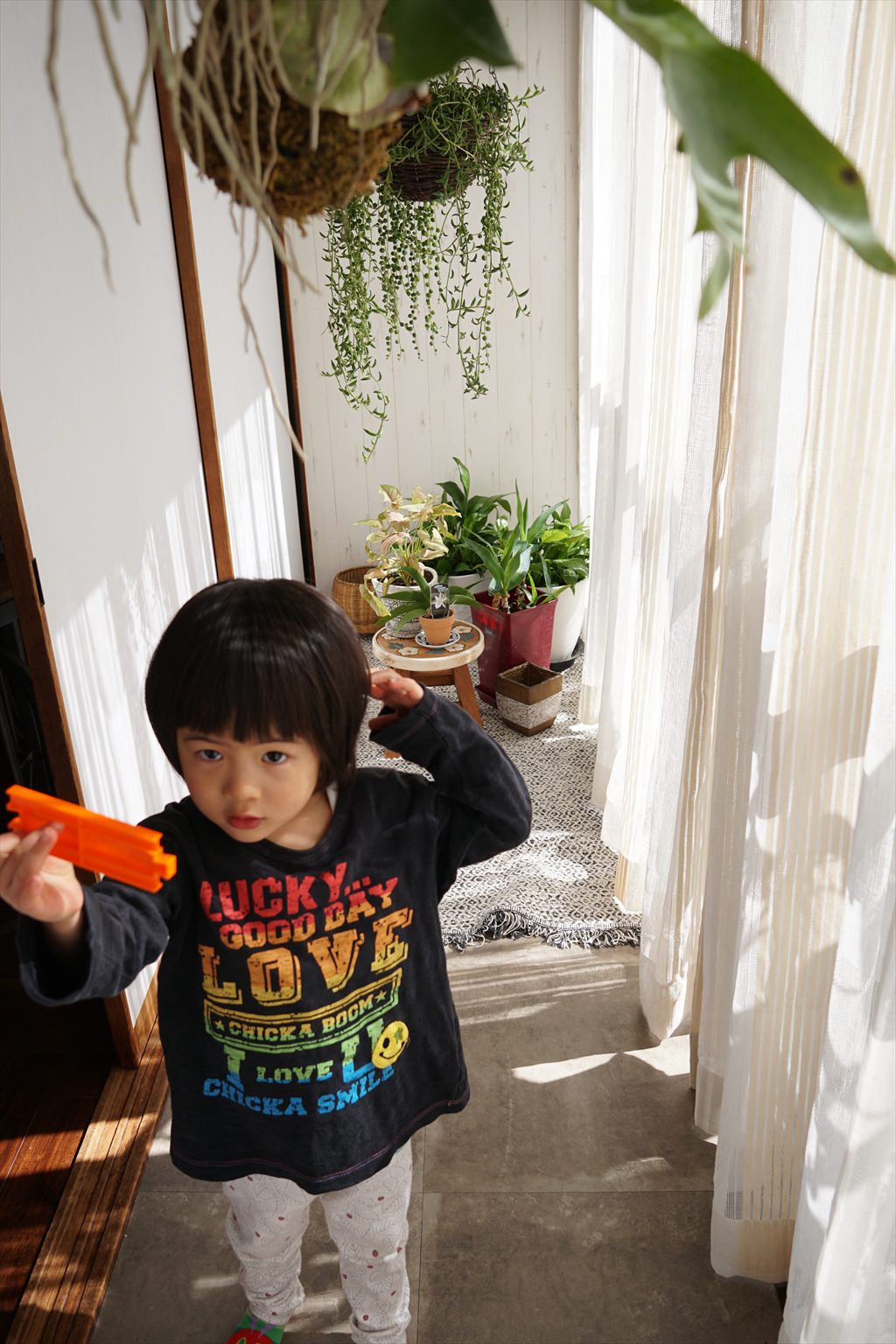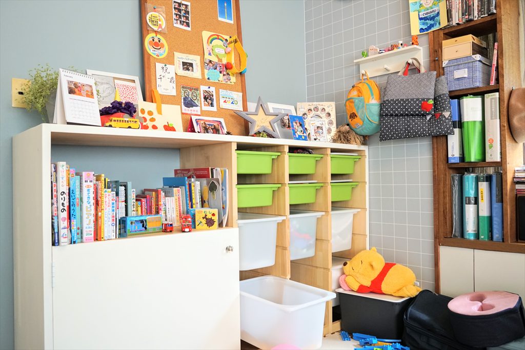 リビングの一面はIKEAの引き出し(トロファスト)に合わせた造作棚をレイアウトしました。